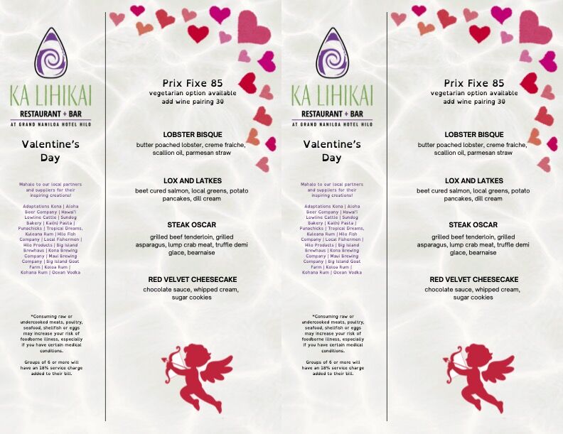 Celebrate Valentine’s Day at Ka Lihikai Restaurant & Bar at Grand Naniloa Hotel Hilo with an elegant prix fixe dining experience designed for a memorable night out. Guests will enjoy thoughtfully crafted courses featuring fresh seafood, premium cuts, and indulgent desserts, with an optional wine pairing to elevate the evening. It’s a romantic way to savor island flavors and celebrate with someone special.