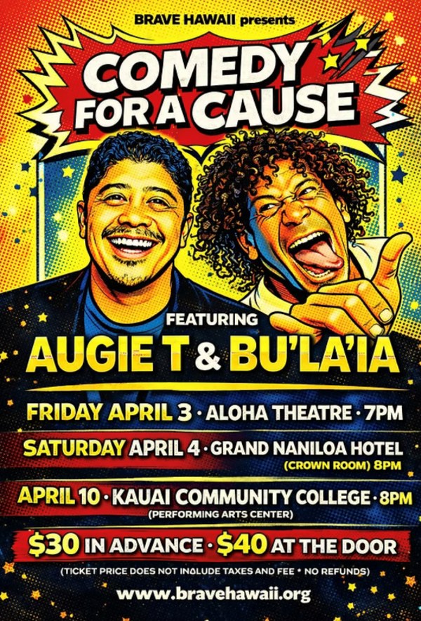 Enjoy a night of laughs at Grand Naniloa Hilo Hotel with Comedy for a Cause, presented by Brave Hawaii. Featuring local favorites Augie T and Bu‘la‘ia, this high-energy show brings island-style humor to the Crown Room for one unforgettable evening.