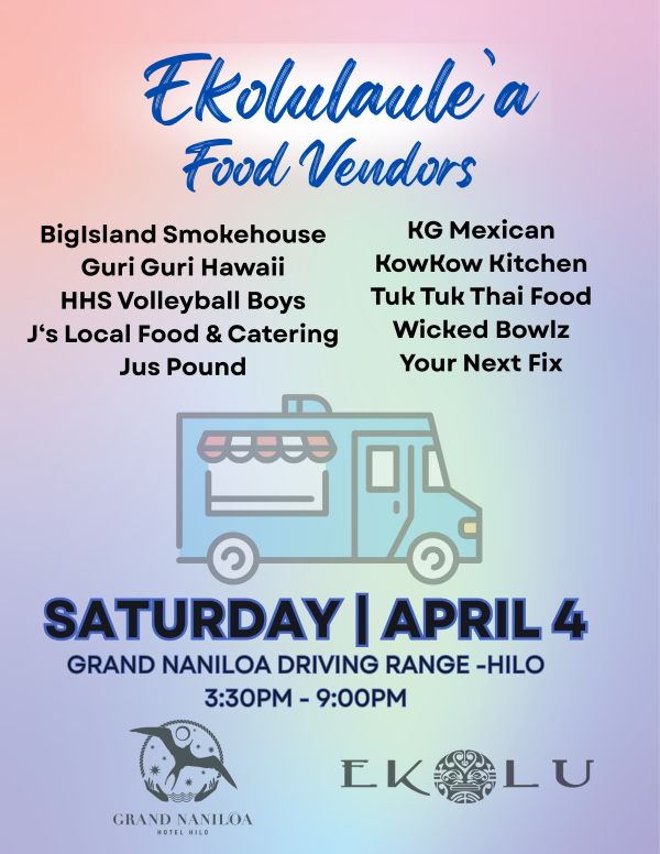 Join us on Saturday, April 4, with festivities beginning at 3:30 PM and live music starting at 4:15 PM. Enjoy performances from top island artists including Ekolu, Micah G, Wavvy, Pohaku, and Nawai, while indulging in a variety of local favorites—from BBQ and comfort food to Thai, Mexican, and sweet treats—served by some of Hilo’s most popular vendors.