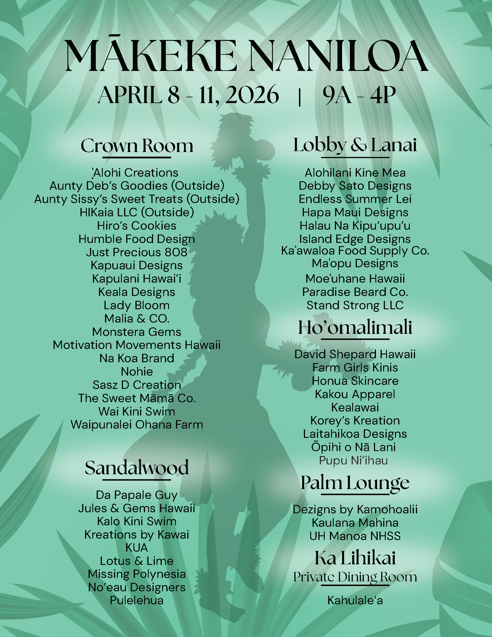 Held April 8–11, 2026 from 9:00 AM to 4:00 PM, the marketplace spans the Crown Room, Lobby & Lanai, creating a lively atmosphere where guests can browse, shop, and connect with the creativity of the islands.